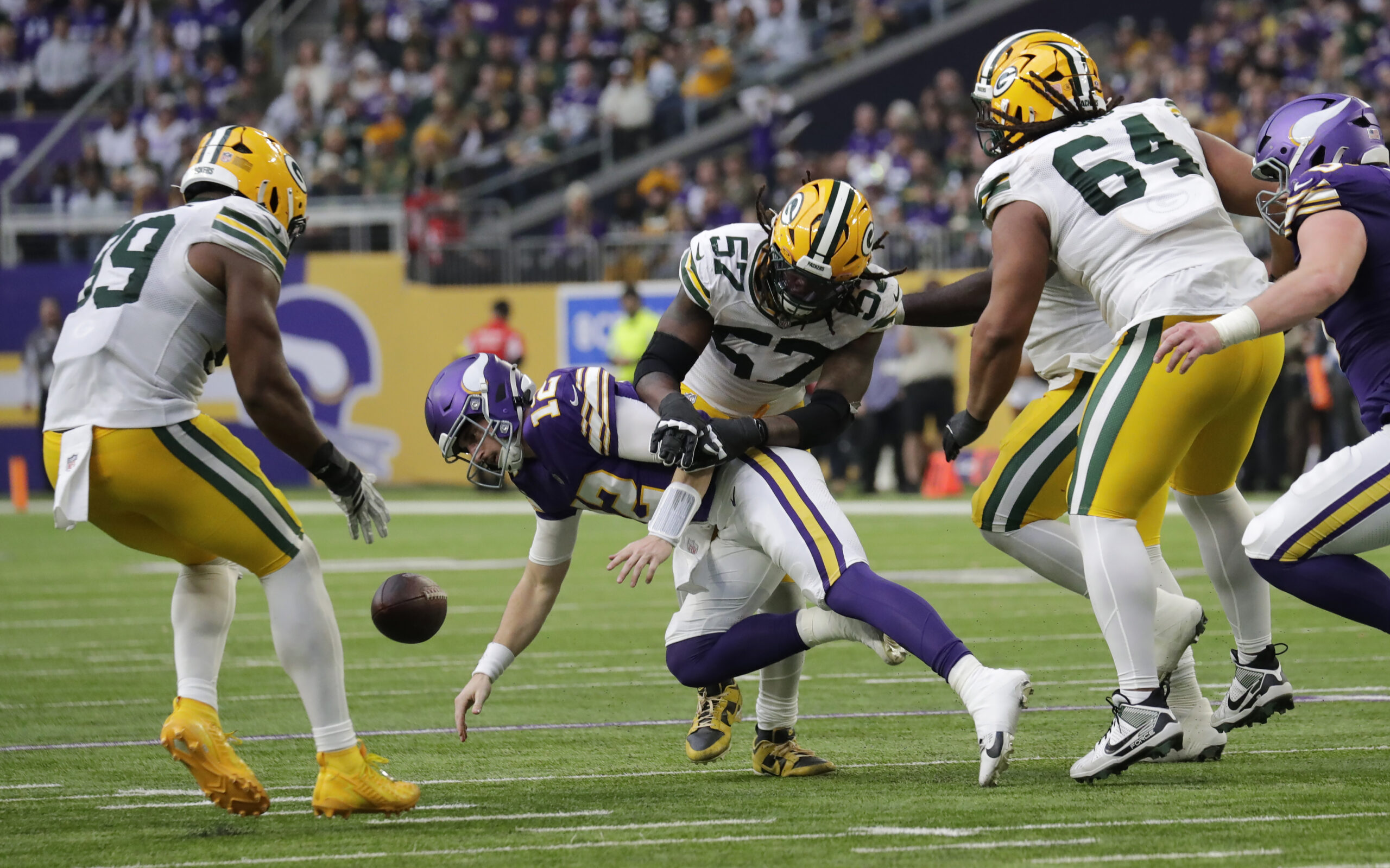 Jan 4, 2026; Minneapolis, Minnesota, USA; Green Bay Packers defensive end Brenton Cox Jr. (57) causes a fumble by Minnesota Vikings quarterback Max Brosmer (12) that is recovered by defensive end Barryn Sorrell (99) in the fourth quarter during the game at U.S. Bank Stadium. Mandatory Credit: Dan Powers-USA TODAY Network via Imagn Images