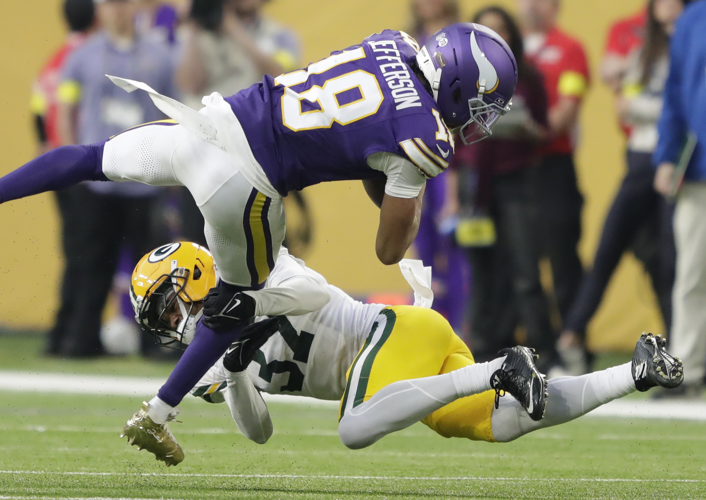 Jan 4, 2026; Minneapolis, Minnesota, USA; Green Bay Packers cornerback Johnathan Baldwin (37) tackles Minnesota Vikings wide receiver Justin Jefferson (18) at U.S. Bank Stadium. Mandatory Credit: Jeffrey Becker-Imagn Images