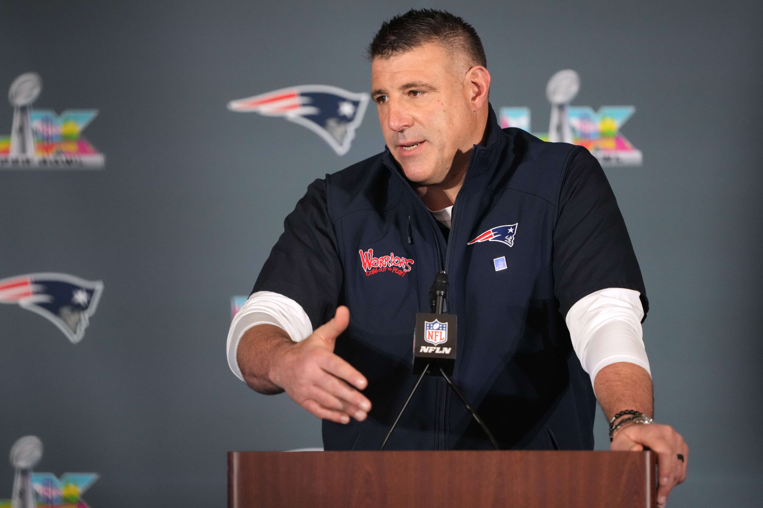 Feb 5, 2026; Santa Clara, CA, USA; New England Patriots head coach Mike Vrabel talks to media members at the Santa Clara Marriott. Mandatory Credit: Darren Yamashita-Imagn Images