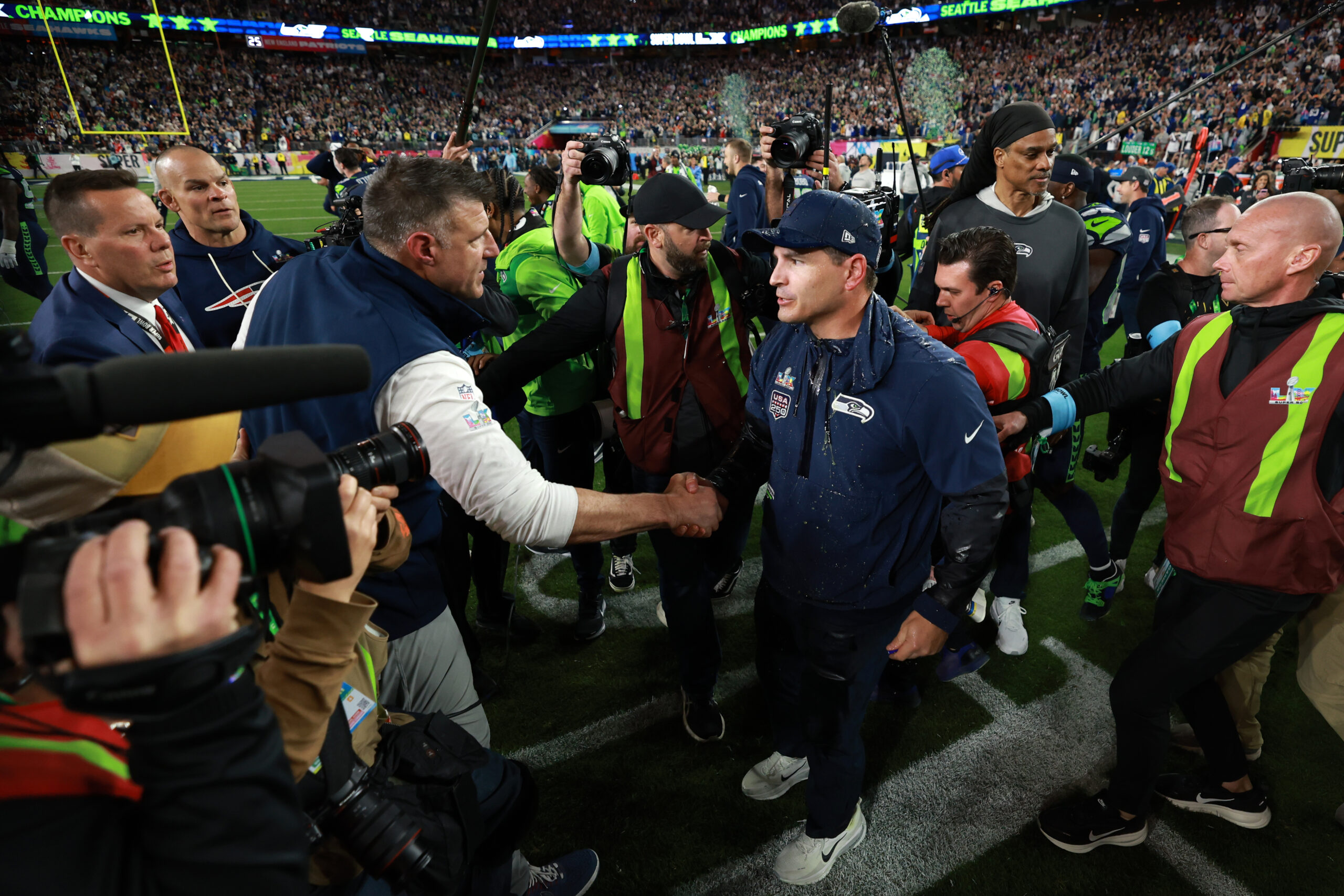 Feb 8, 2026; Santa Clara, CA, USA; New England Patriots head coach Mike Vrabel and Seattle Seahawks head coach Mike MacDonald shake hands after Super Bowl LX at Levi’s Stadium. Mandatory Credit: Mark J. Rebilas-Imagn Images