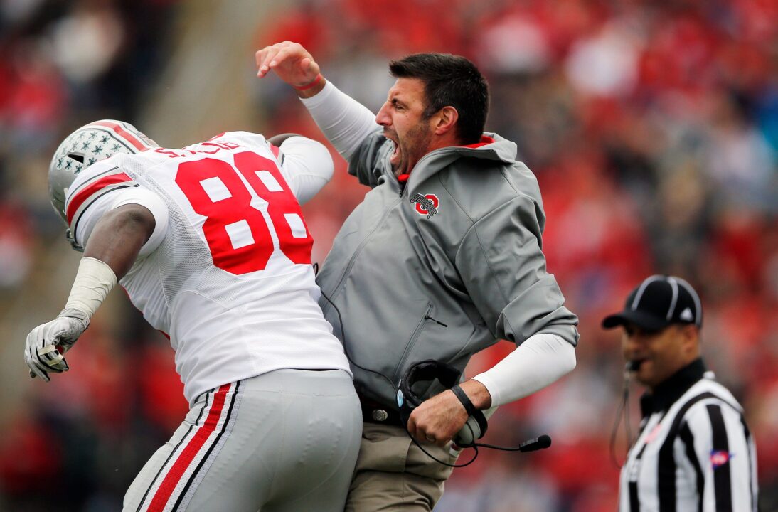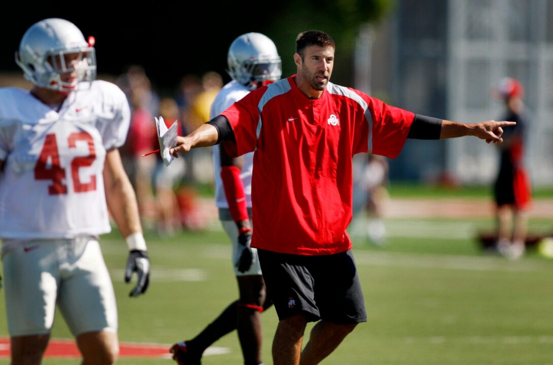 Ohio State’s Andrew Sweat (42) and linebacker coach Mike Vrabel, right, shown at football practice August 16, 2011, at Woody Hayes Athletic Center.-Imagn Images