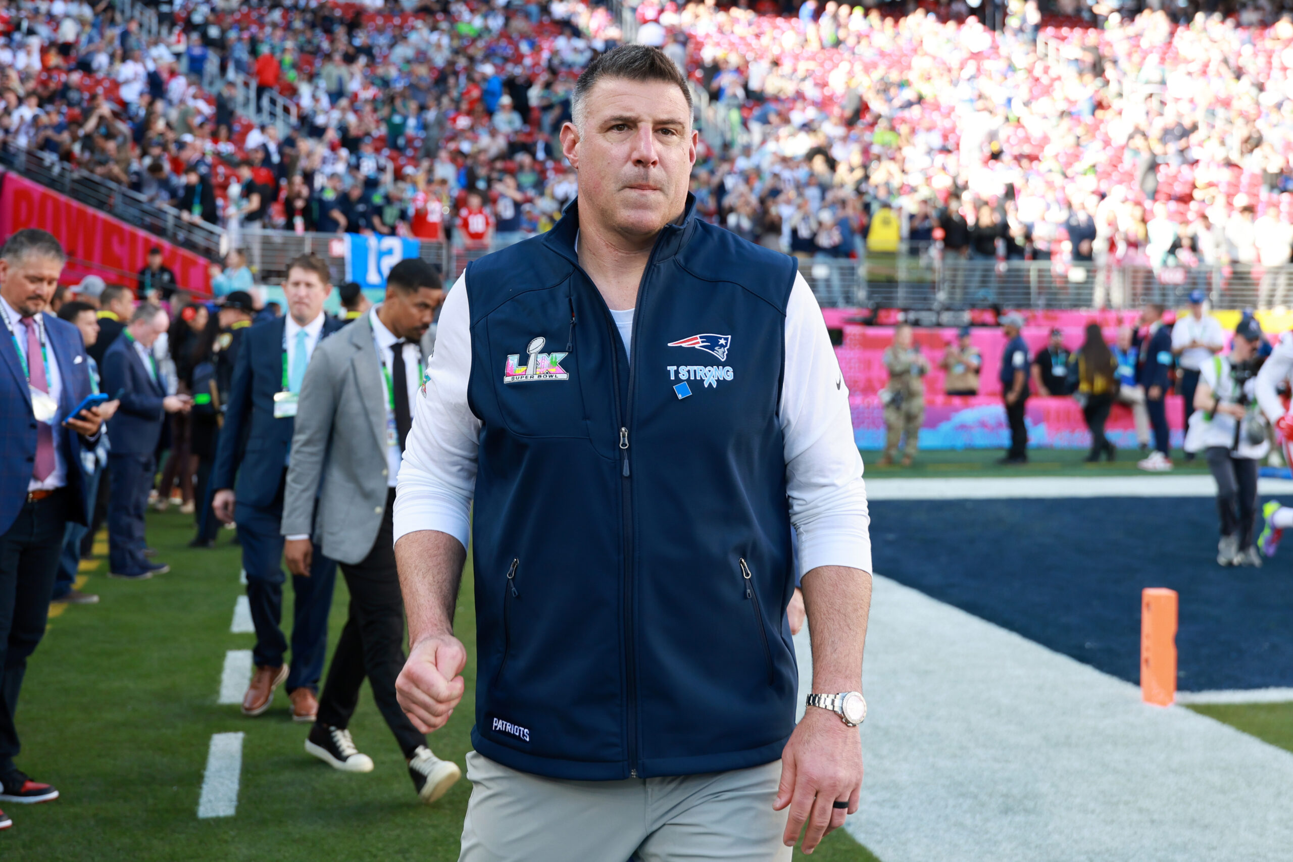 Feb 8, 2026; Santa Clara, CA, USA; New England Patriots head coach Mike Vrabel walks on field before Super Bowl LX against the Seattle Seahawks at Levi’s Stadium. Mandatory Credit: Mark J. Rebilas-Imagn Images