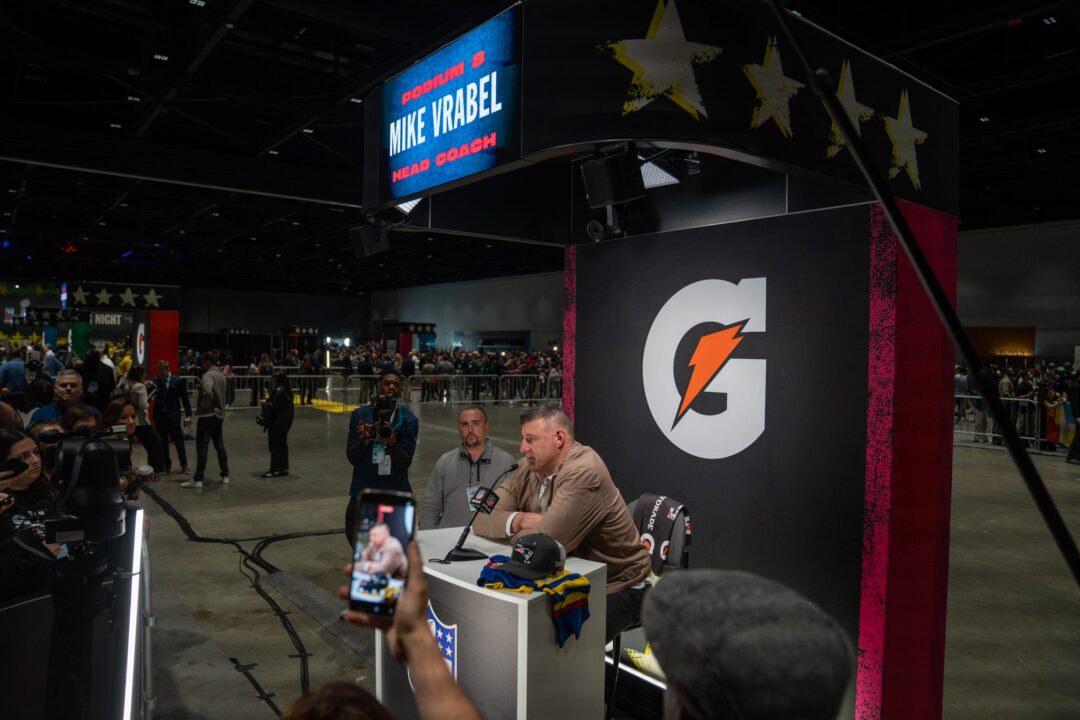 Feb 5, 2026; Santa Clara, CA, USA; New England Patriots head coach Mike Vrabel talks to media members at the Santa Clara Marriott. Mandatory Credit: Darren Yamashita-Imagn Images