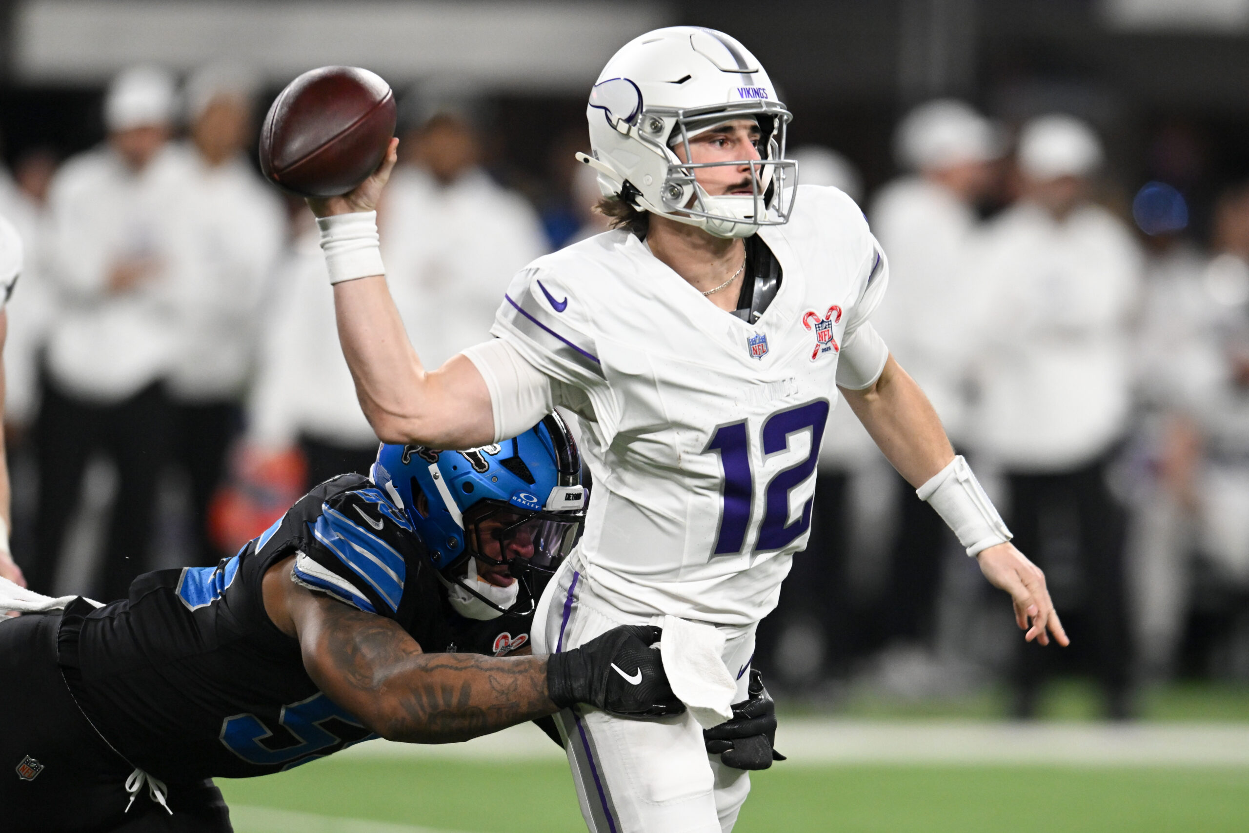 Dec 25, 2025; Minneapolis, Minnesota, USA; Minnesota Vikings quarterback Max Brosmer (12) passes the ball under pressure from Detroit Lions linebacker Derrick Barnes (55) in the second quarter at U.S. Bank Stadium. Mandatory Credit: Jeffrey Becker-Imagn Images