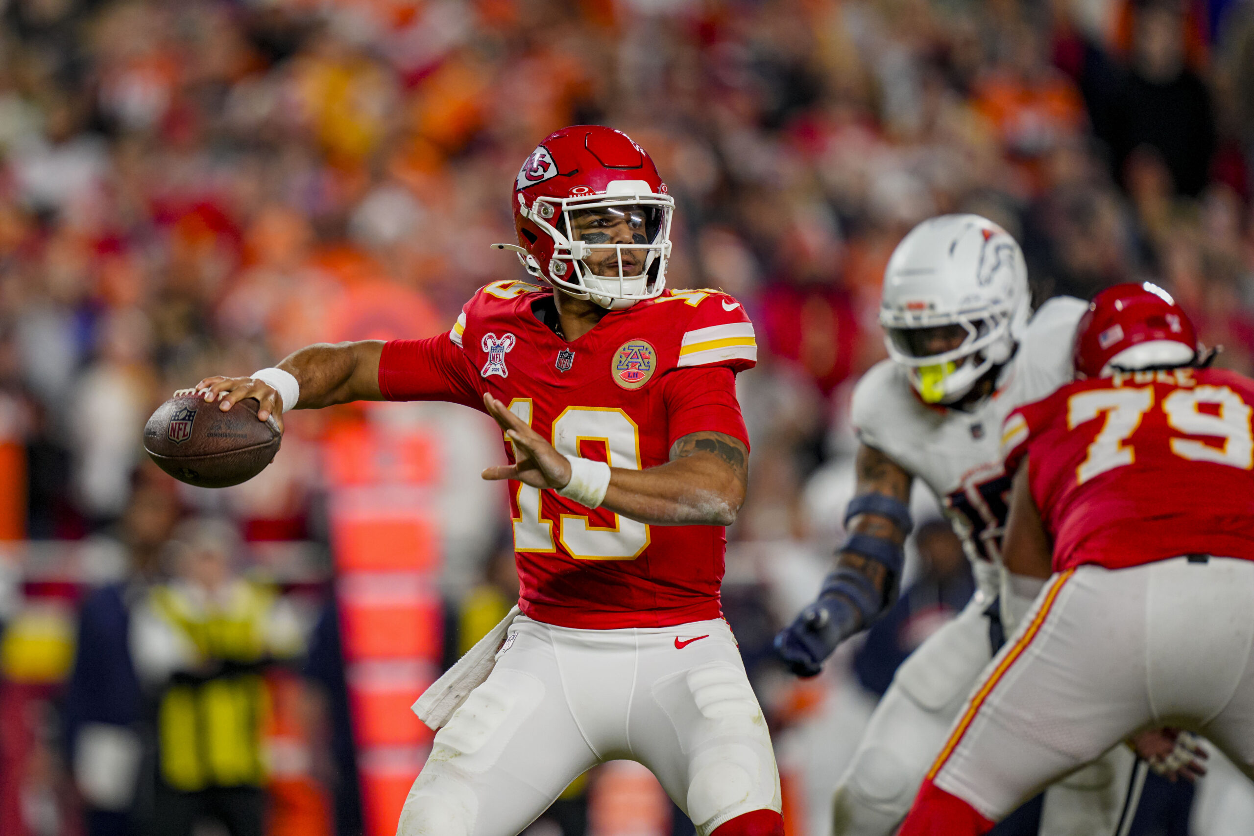Dec 25, 2025; Kansas City, Missouri, USA; Kansas City Chiefs quarterback Chris Oladokun (19) throws the ball during the fourth quarter at GEHA Field at Arrowhead Stadium. Mandatory Credit: Jay Biggerstaff-Imagn Images