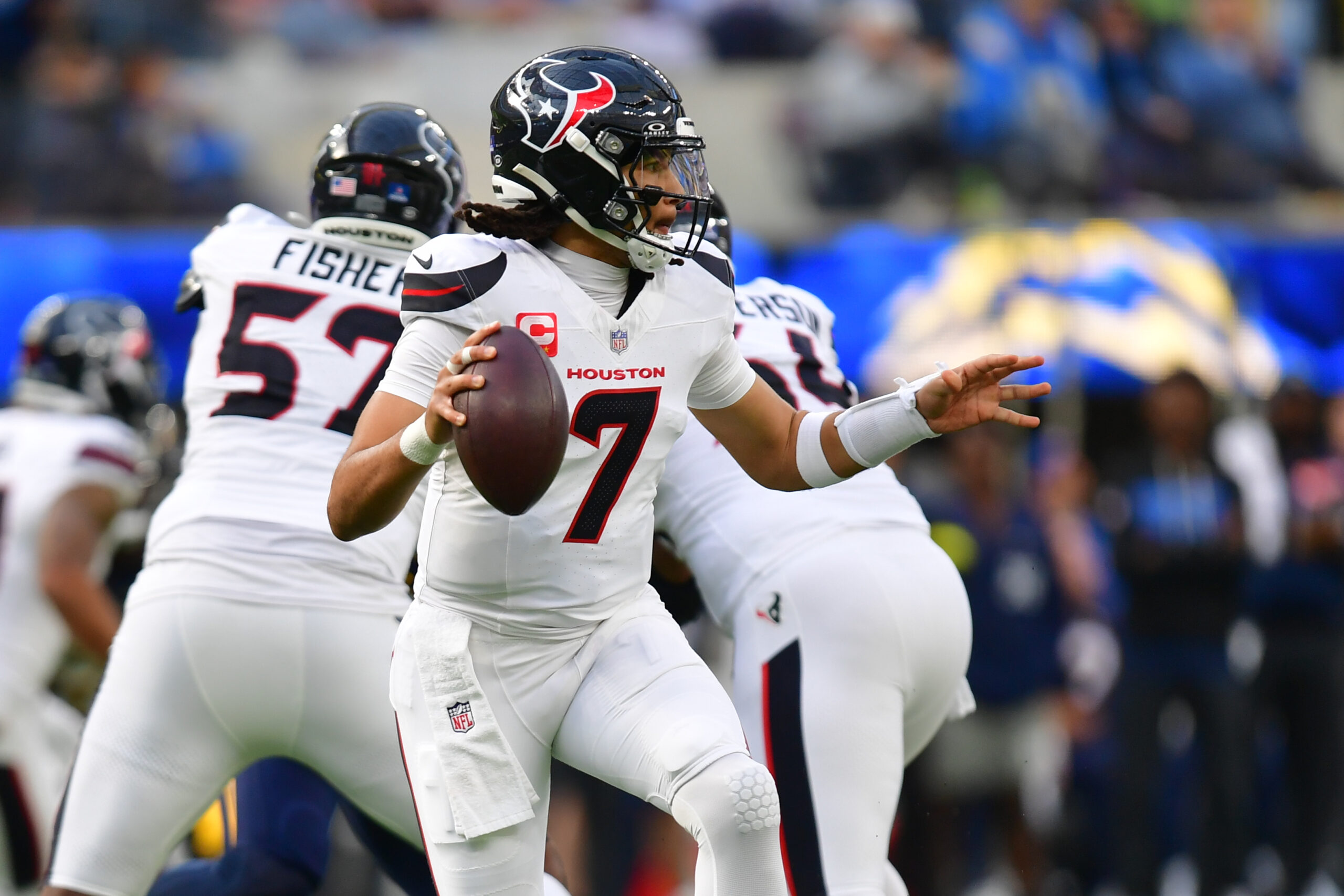 Dec 27, 2025; Inglewood, California, USA; Houston Texans quarterback C.J. Stroud (7) looks downfield for an open receiver against the Los Angeles Chargers during the first half at SoFi Stadium. Mandatory Credit: Gary A. Vasquez-Imagn Images