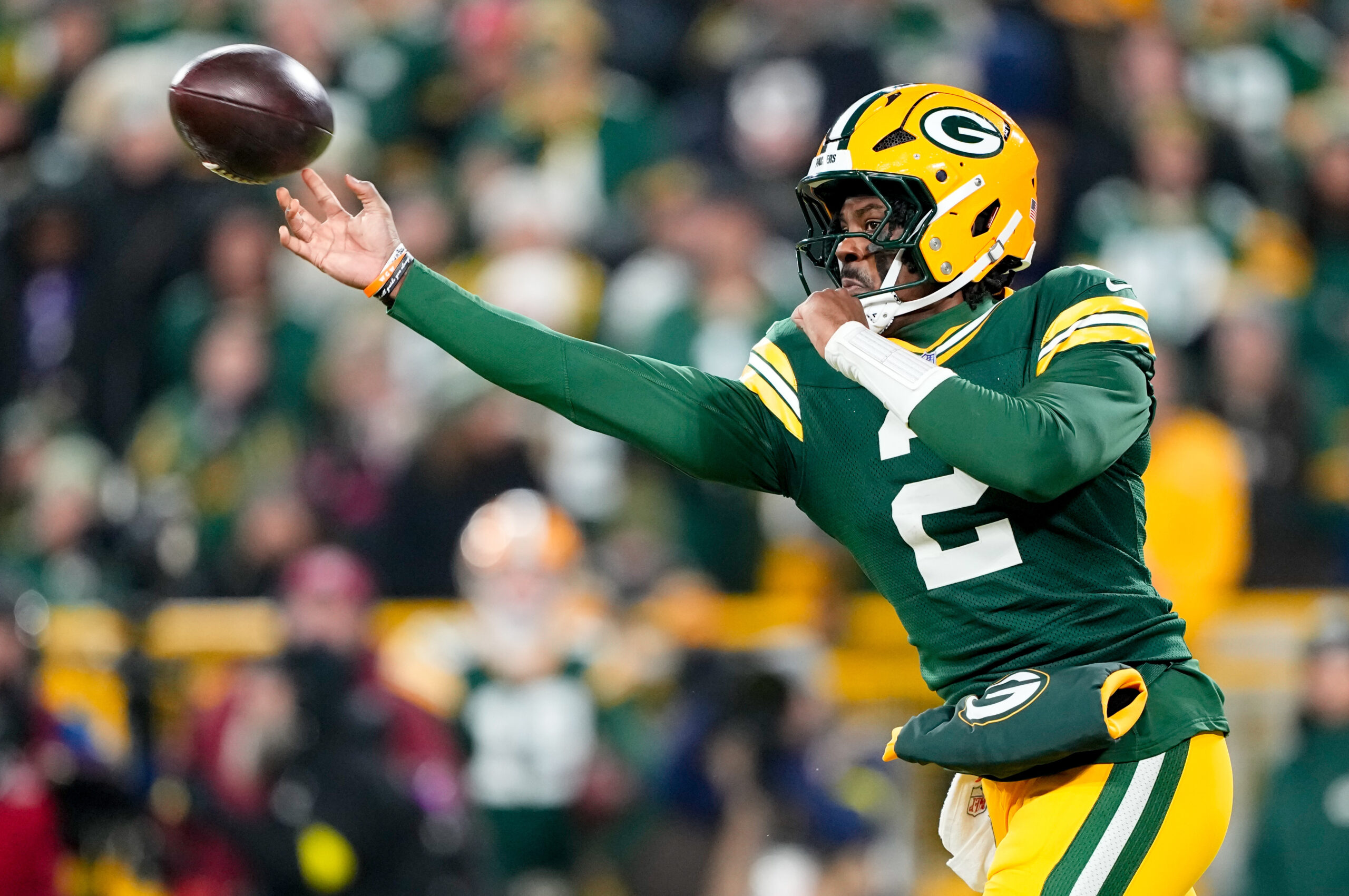 Dec 27, 2025; Green Bay, Wisconsin, USA; Green Bay Packers quarterback Malik Willis (2) throws a pass during the second quarter against the Baltimore Ravens at Lambeau Field. Mandatory Credit: Jeff Hanisch-Imagn Images