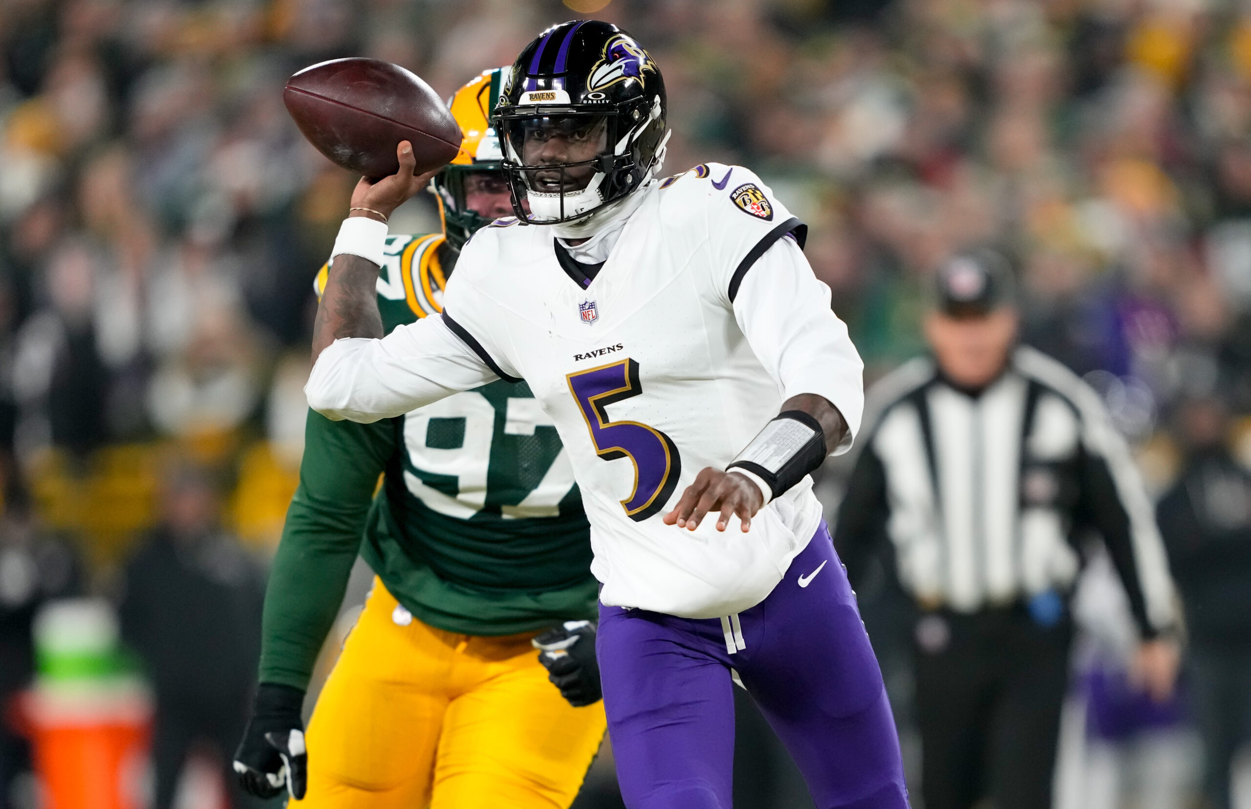 Dec 27, 2025; Green Bay, Wisconsin, USA; Baltimore Ravens quarterback Tyler Huntley (5) looks to throw a pass as Green Bay Packers defensive tackle Jordon Riley (97) defends during the first quarter at Lambeau Field. Mandatory Credit: Kayla Wolf-Imagn Images
