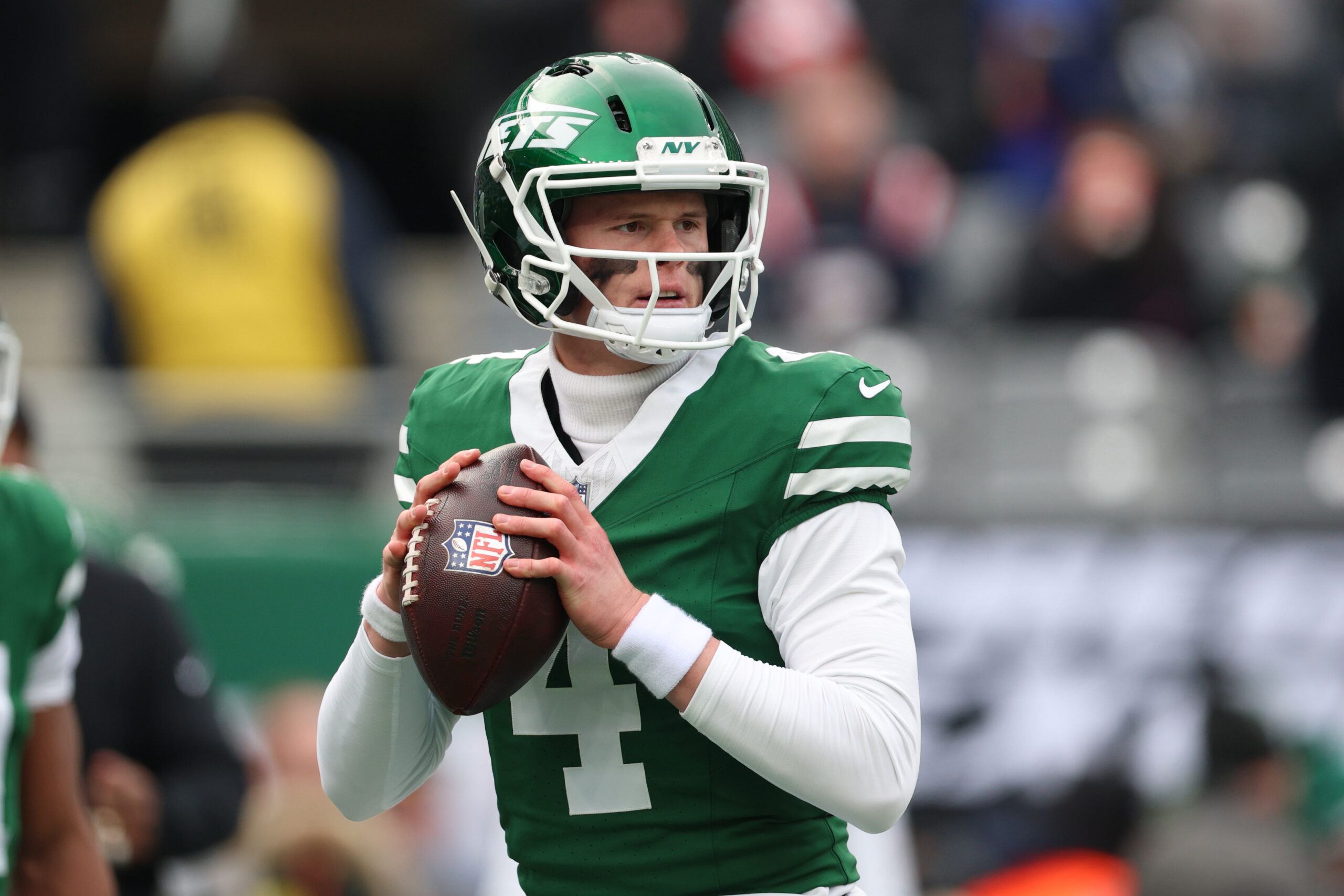 Dec 28, 2025; East Rutherford, New Jersey, USA; New York Jets quarterback Brady Cook (4) warms up prior to the game against the New England Patriots at MetLife Stadium. Mandatory Credit: Vincent Carchietta-Imagn Images