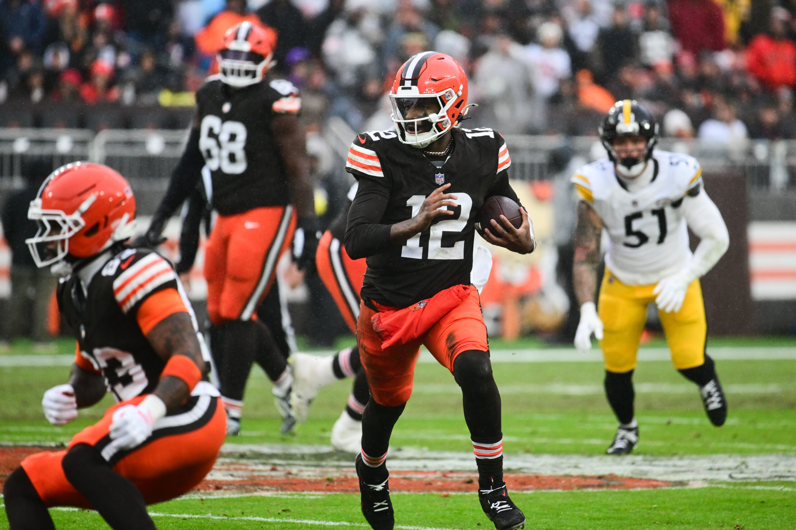 Dec 28, 2025; Cleveland, Ohio, USA; Cleveland Browns quarterback Shedeur Sanders (12) runs with the ball in the second quarter against the Pittsburgh Steelers at Huntington Bank Field. Mandatory Credit: Ken Blaze-Imagn Images