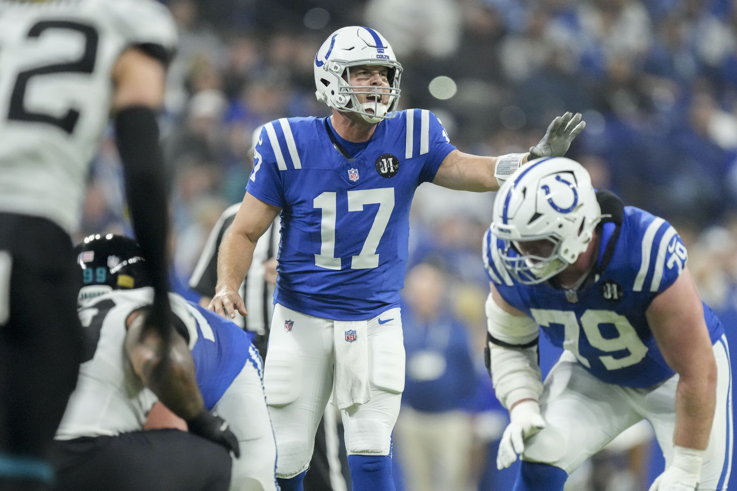 Dec 28, 2025; Indianapolis, Indiana, USA; Indianapolis Colts quarterback Philip Rivers (17) yells at the line of scrimmage during a game against the Jacksonville Jaguar at Lucas Oil Stadium. Mandatory Credit: Grace Hollars-USA TODAY Network via Imagn Images