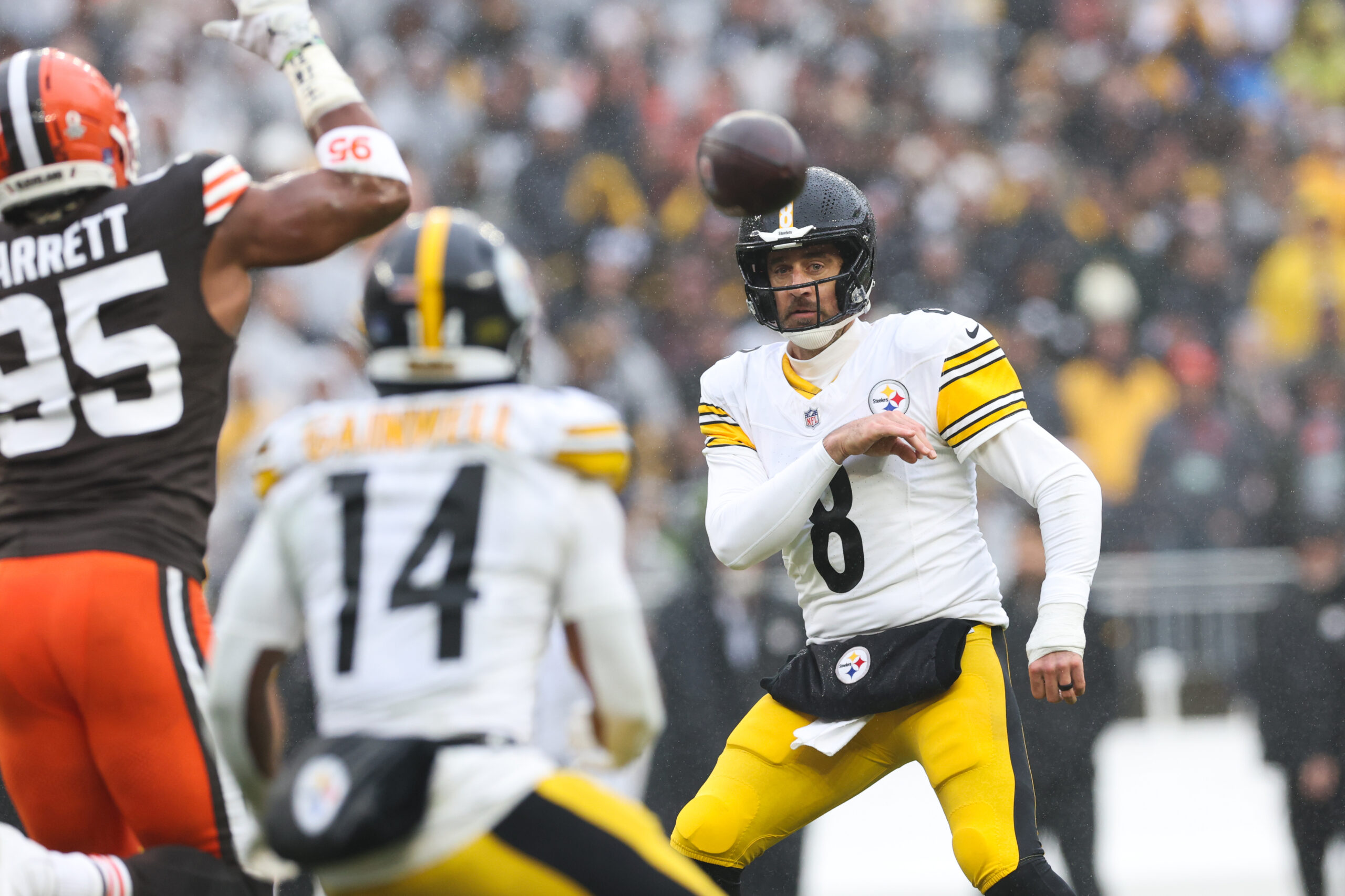 Dec 28, 2025; Cleveland, Ohio, USA; Pittsburgh Steelers quarterback Aaron Rodgers (8) throws in the first quarter against the Cleveland Browns at Huntington Bank Field. Mandatory Credit: Scott Galvin-Imagn Images