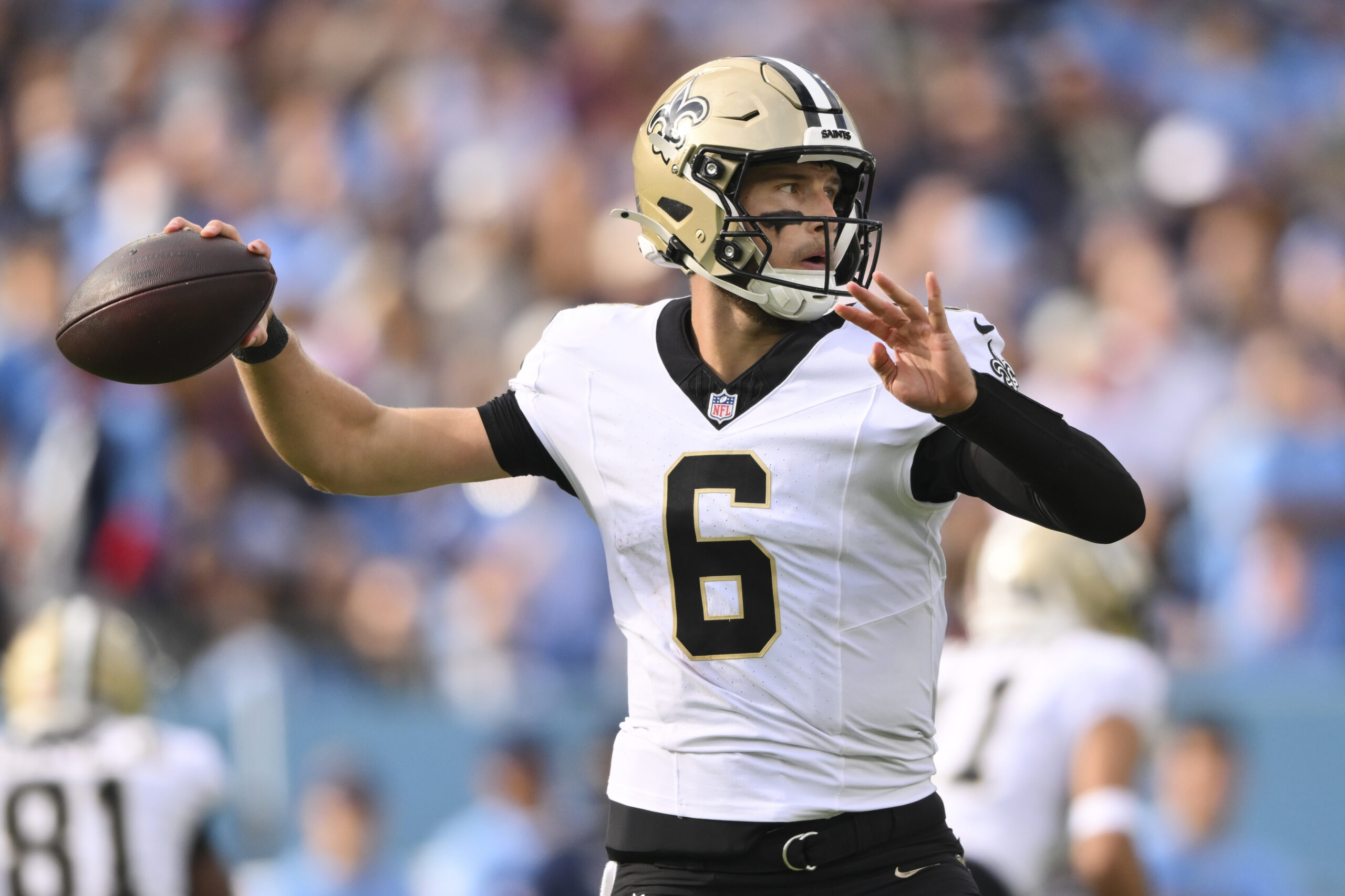 Dec 28, 2025; Nashville, Tennessee, USA; New Orleans Saints quarterback Tyler Shough (6) passes against the Tennessee Titans during the first half of the game at Nissan Stadium. Mandatory Credit: Steve Roberts-Imagn Images