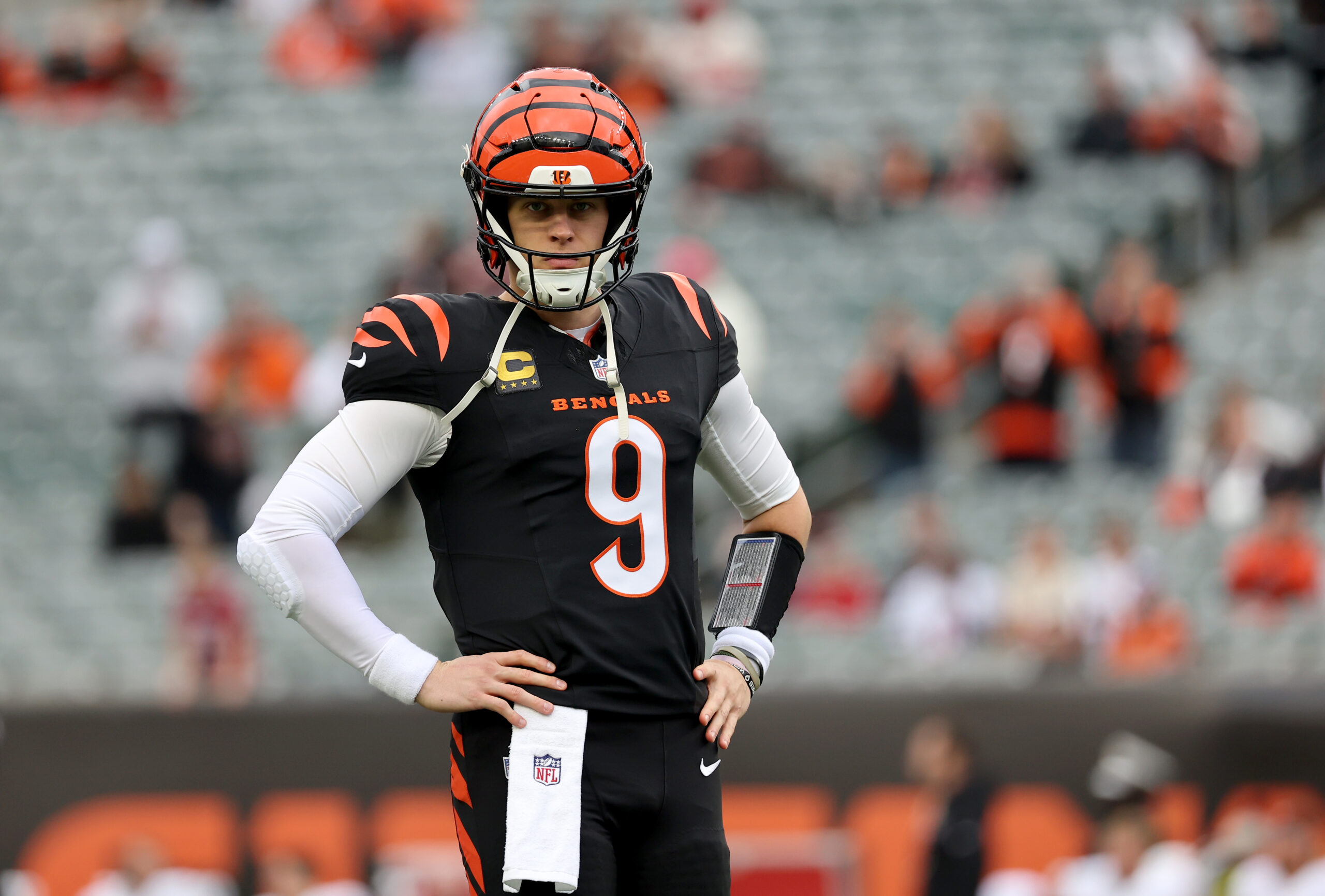 Dec 28, 2025; Cincinnati, Ohio, USA; Cincinnati Bengals quarterback Joe Burrow (9) warms up before a game against the Arizona Cardinals at Paycor Stadium. Mandatory Credit: Joseph Maiorana-Imagn Images