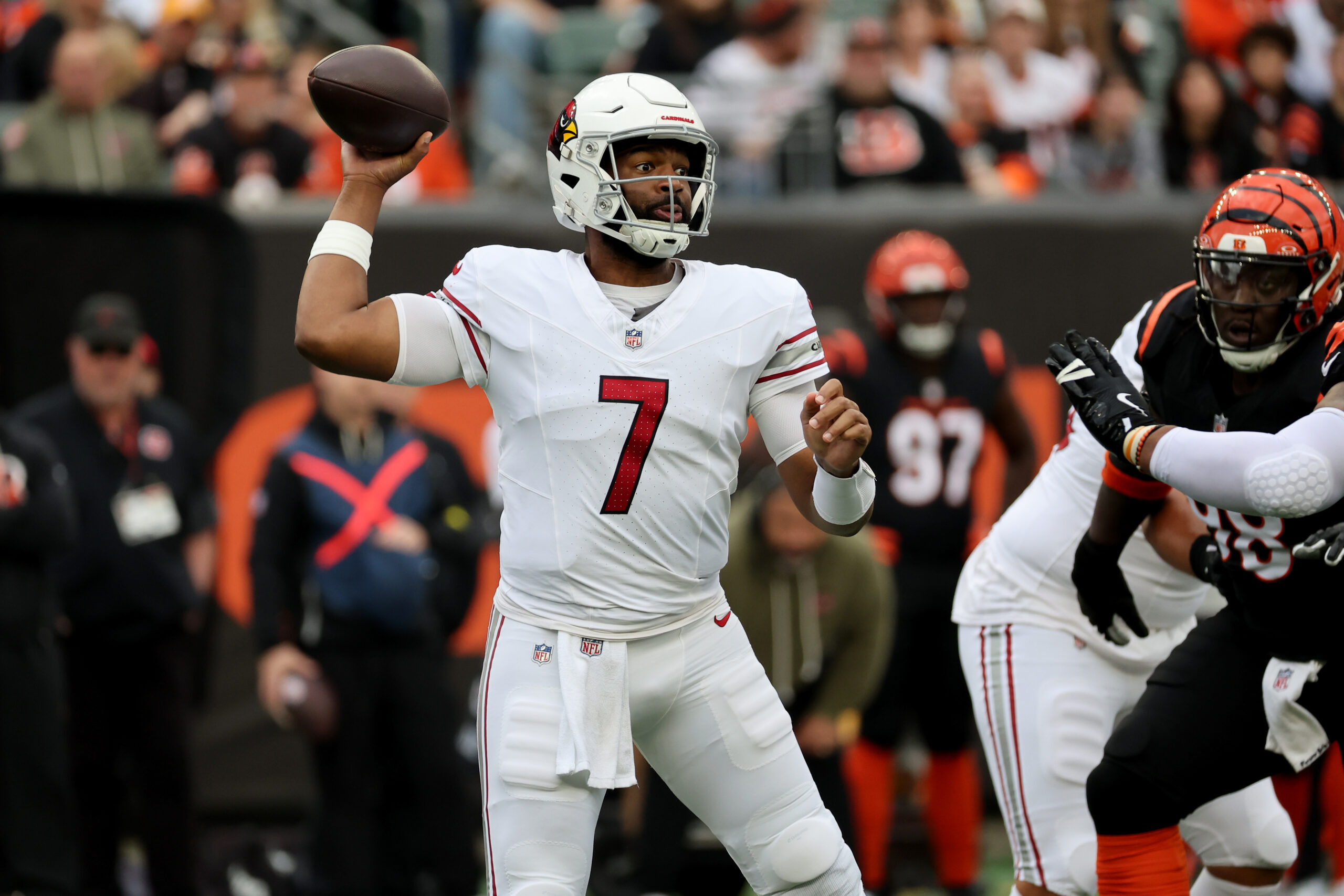 Dec 28, 2025; Cincinnati, Ohio, USA; Arizona Cardinals quarterback Jacoby Brissett (7) throws during the first half against the Cincinnati Bengals at Paycor Stadium. Mandatory Credit: Joseph Maiorana-Imagn Images