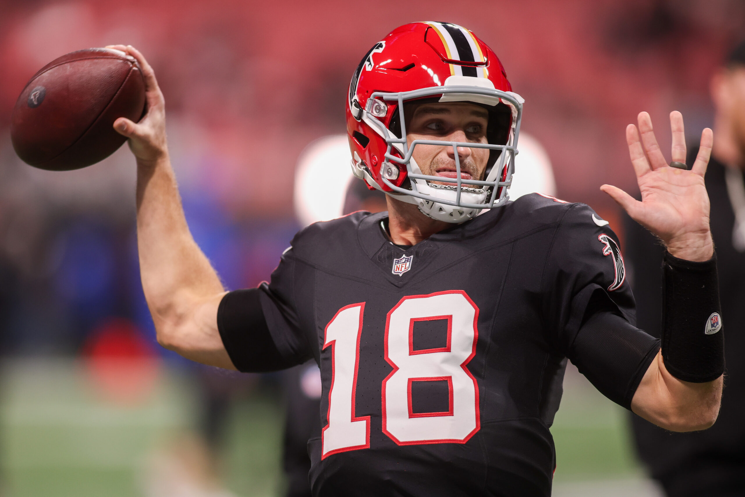 Dec 29, 2025; Atlanta, Georgia, USA; Atlanta Falcons quarterback Kirk Cousins (18) warms up before a game against the Los Angeles Rams at Mercedes-Benz Stadium. Mandatory Credit: Brett Davis-Imagn Images