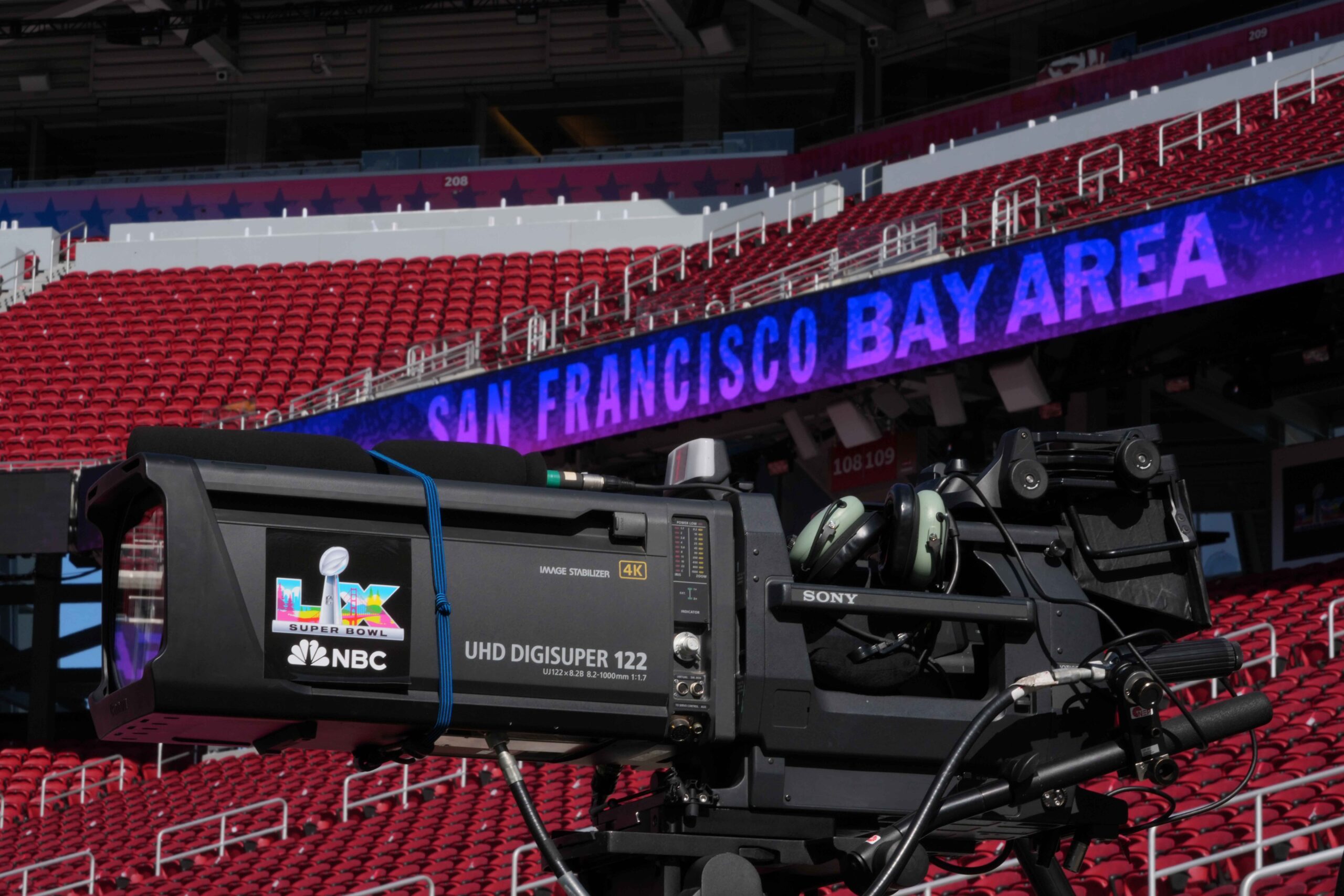 Feb 4, 2026; Santa Clara, CA, USA; NBC Peacock television camera with Super Bowl LX logo at Levi’s Stadium. Mandatory Credit: Kirby Lee-Imagn Images