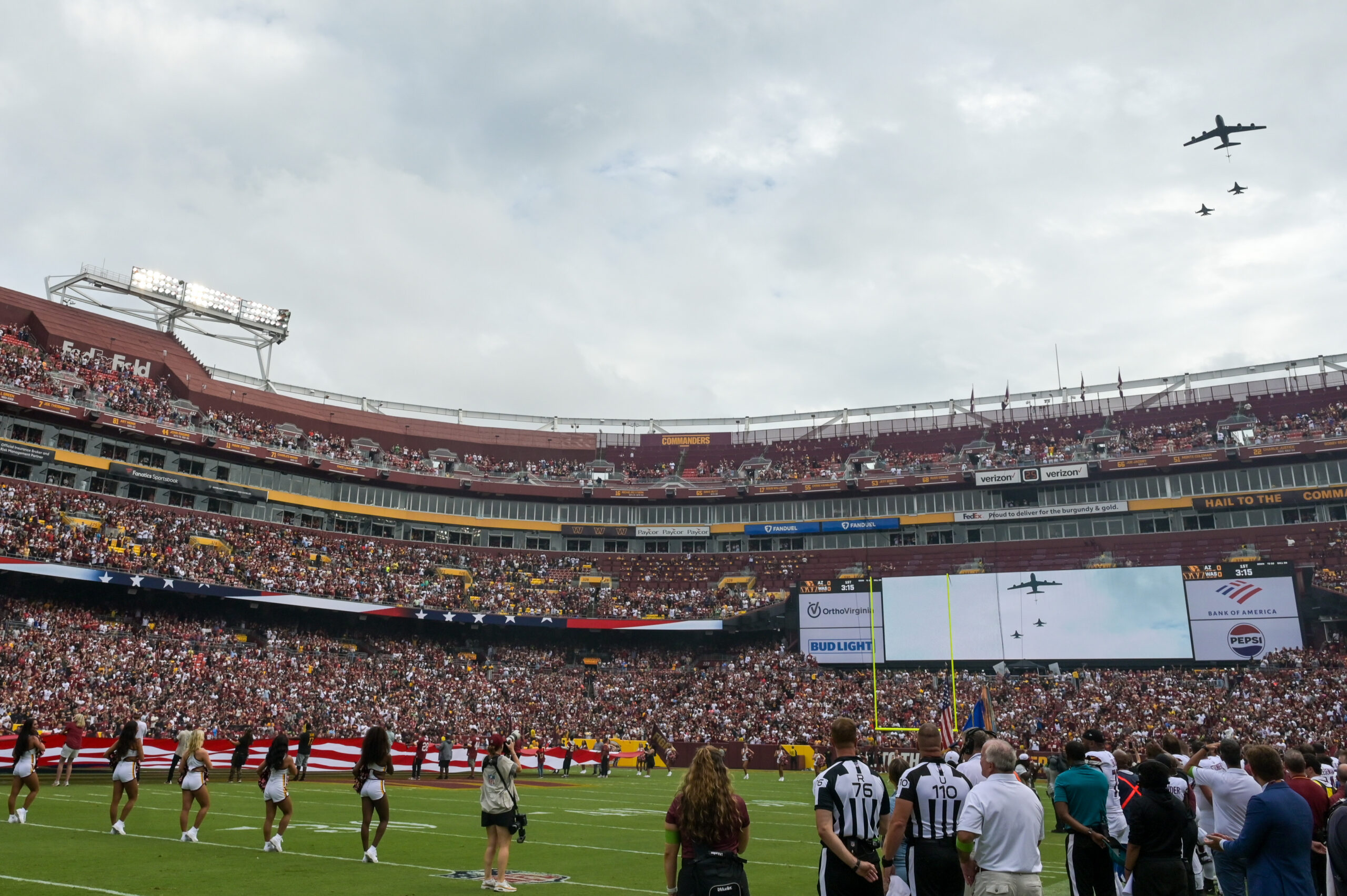 Sep 10, 2023; Landover, Maryland, USA; Air Force KC-135 refuler ad two F-16s fly over FedExField before the game between the Washington Commanders and the Arizona Cardinals . Mandatory Credit: Tommy Gilligan-Imagn Images